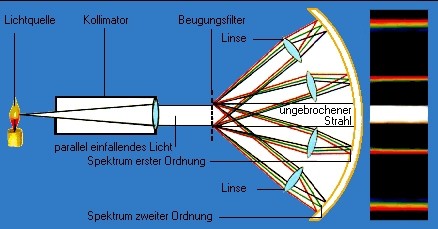Ein Beugungsgitter spaltet das einfallende weiße Licht in eine Reihe von Spektren auf, da der rötliche langwellige Lichtanteil stärker gebeugt wird als der kurzwellige blaue. Das Spektrum erster Ordnung zu beiden Seiten des ungebeugt hindurchtretenden Lichtstrahls ist das schmalste und gleichzeitig das hellste. Weiter außen folgen die Spektren zweiter, dritter und vierter Ordnung, die sich über einen größeren Raum ausbreiten, aber auch lichtschwächer werden.