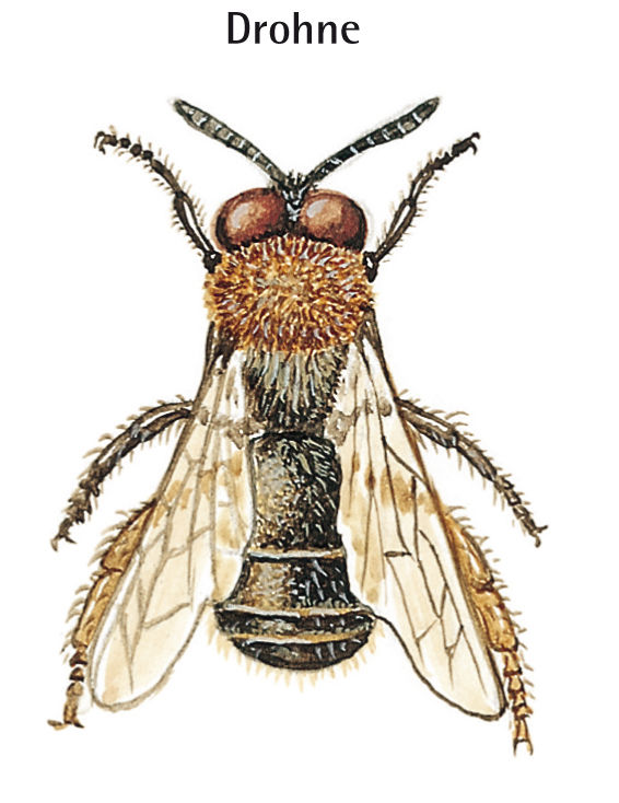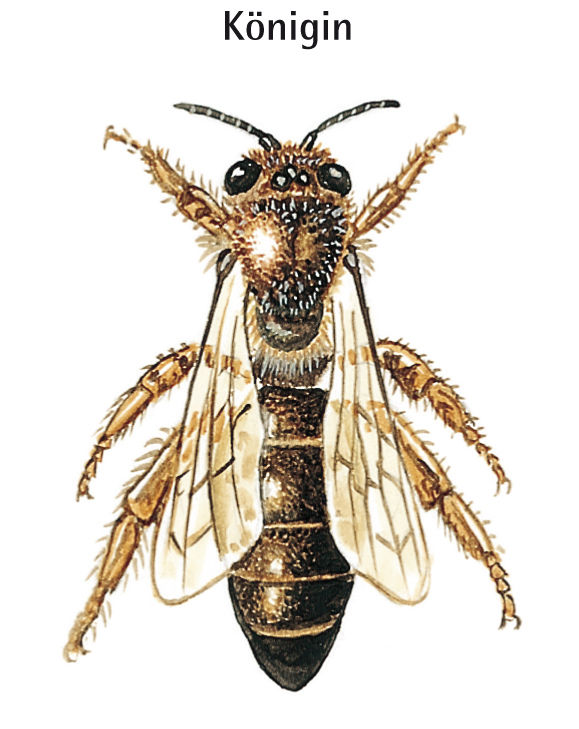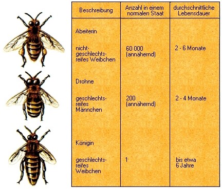 Der Staat der Bienen besteht aus Arbeiterinnen, Drohnen und der Königin. Die Königin sorgt für den Zusammenhalt des Stockes und legt täglich 1500-2000 Eier. Drohnen befruchten die Königin, und die Arbeiterinnen suchen Nahrung, stellen die Waben her und führen auch alle übrigen Tätigkeiten im Stock aus.