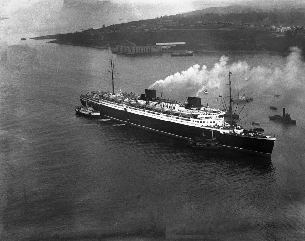 Die »Queen Mary«, britischer Gigant der Meere, liegt nach ihrer Trans-Atlantik-Jungfernfahrt 1936 vor den New Yorker Docks.