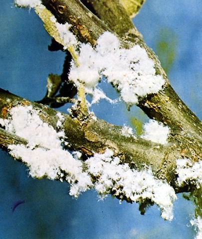 Die Blutlaus (Eriosoma lanigerum) ist einer der größten Schädlinge des Obstbaus. Die Tiere sitzen dicht gedrängt unter den weißen flockigen Bäuschen ihrer Wachsausscheidungen. Der Name stammt von der blutroten Farbe der Körperflüssigkeit.