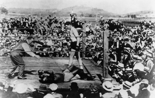 Boxkampf zwischen Jack Johnson und Jess Willard 1915: Jack Johnson wird in der 26. Runde K.o. geschlagen.