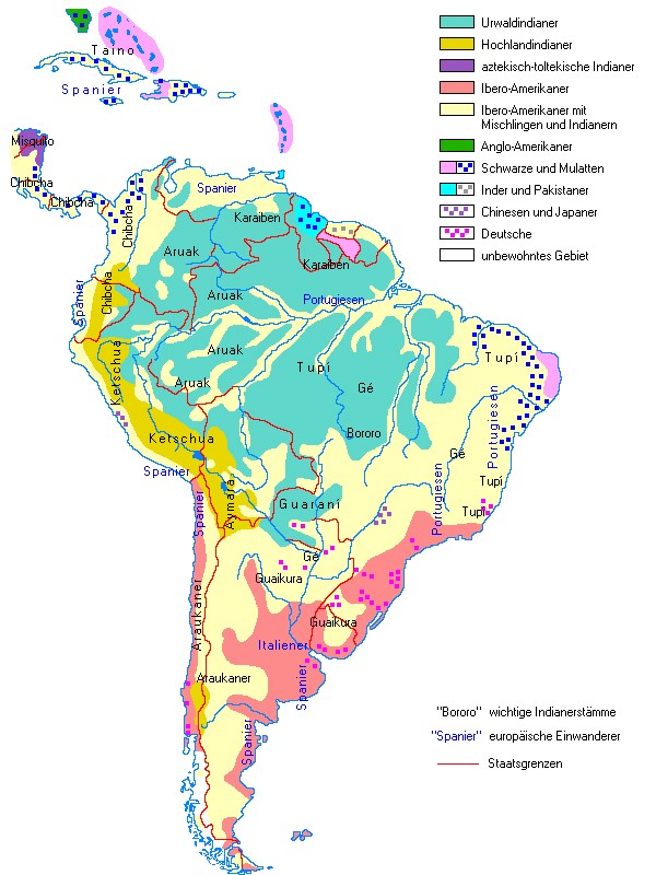 Die meisten Brasilianer sind Nachkommen portugiesischer Einwanderer. Viele von ihnen haben sich mit den Nachfahren der aus Afrika eingeschleppten Sklaven vermischt (Mulatten, Mestizen und Cafusos). Die indigene Minderheit setzt sich aus über 150 verschiedenen Indianerstämmen zusammen. Sie lebt meist in Reservaten (etwa ein Zehntel des Staatsgebietes), die in eigenen Kapiteln der Verfassung geschützt sind, aber auch – entwurzelt – in den Städten.