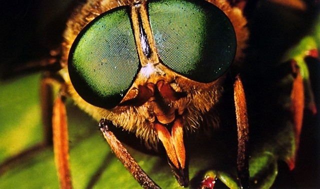 Insekten besitzen Facettenaugen aus vielen keilförmigen Einzelaugen. Diese vermitteln jeweils den Helligkeitswert eines kleinen Bildausschnitts. Mit ihren mehreren tausend Einzelaugen sieht die Bremse ein mosaikartig zusammengesetztes Bild.