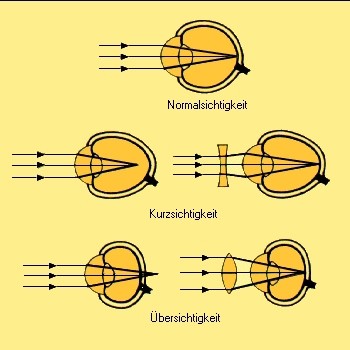 Oben: Strahlenverlauf bei Normalsichtigkeit Mitte rechts: Zerstreuungslinse (konkav) zur Korrektur von Kurzsichtigkeit Unten rechts: Sammellinse (konvex) zur Korrektur von Übersichtigkeit