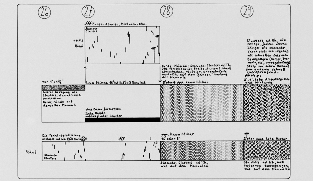 »Volumina«: Orgelwerk in herkömmlicher Partituranordnung mit graphischen Zeichen für Cluster von György Ligeti, 1968
