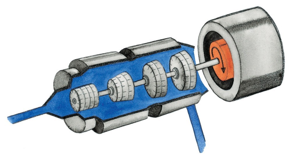 eine nach dem Prinzip der Strömungsmaschine arbeitende, mit Dampf betriebene Wärmekraftmaschine. Turbine.