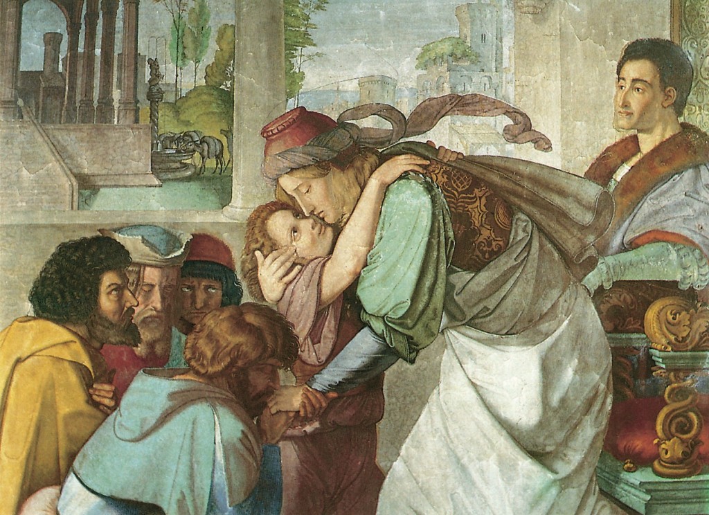 Peter von Cornelius: »Die Wiedererkennung Josephs durch die Brüder«. Ausschnitt aus einem Fresko in der Casa Bartholdy in Rom, geschaffen von der Malervereinigung der Nazarener.