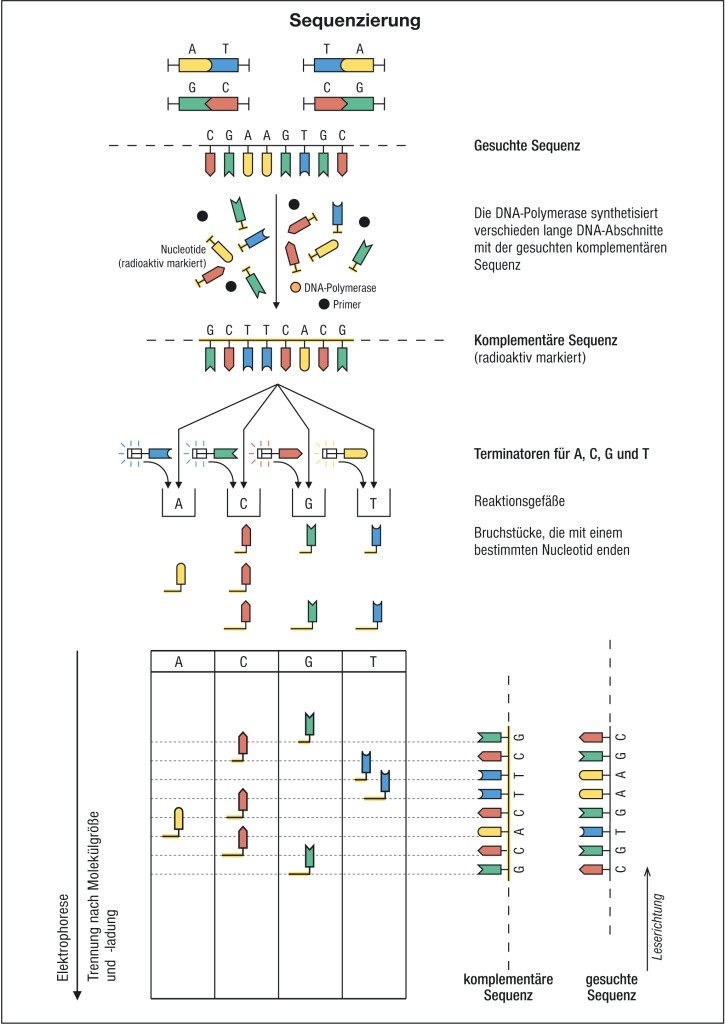 Methoden zur Bestimmung der Basenfolge eines DNA-Abschnittes. Die DNA wird zunächst mittels spezieller Enzyme, den Restriktionsendonucleasen, in überlappende Bruchstücke zerlegt. Nach der Methode von A. Maxam und W. Gilbert wird der radioaktiv markierte DNA-Strang basenspezifisch durch chemische Agenzien gespalten. Nach der enzymatischen Methode von F. Sanger wird ursprünglich ein zu der zu untersuchenden Einzelstrang-DNA komplementärer, radioaktiv markierter Strang eingesetzt. Die bei beiden Methoden entstandenen, verschieden langen DNA-Stücke werden durch Gelelektrophorese (Elektrophorese) getrennt und mittels Autoradiographie sichtbar gemacht. Heute wird vorzugsweise eine automatisierte Variante der Sanger-Methode benutzt. Dabei werden unterschiedlich fluoreszenzmarkierte Nucleotide eingesetzt, was eine Zeit sparende Auffindung nach Laserbestrahlung erlaubt. In einem Zyklus kann ein bis zu 500 Nucleotide umfassender DNA-Strang sequenziert werden. Auch Genomanalyse.