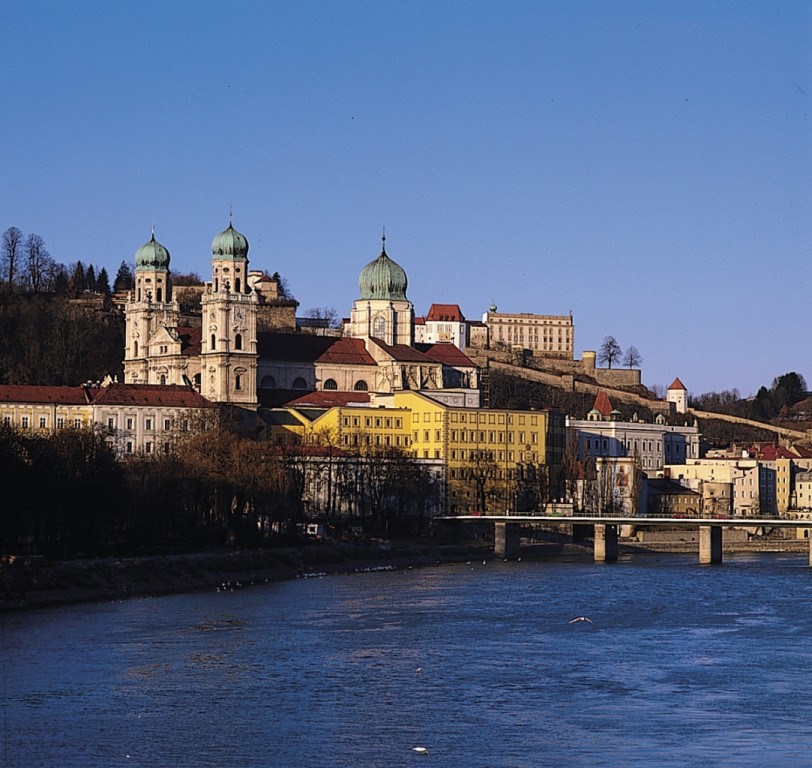 Blick über den Inn auf den Stephansdom und die Altstadt der niederbayerischen Stadt Passau