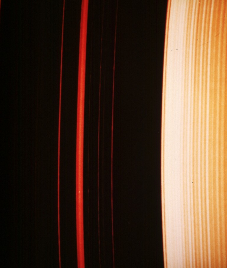 Saturn: Voyager 2-Aufnahme der Encke'schen Teilung, der schwachen dunklen Linie am Rand des A-Rings.