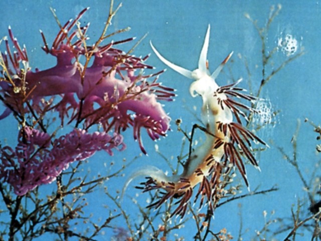 Zwei häufige Fadenschnecken (Aeolidioiae) des Mittelmeers: Flabellina affinis und Hervia costai. Sie sitzen auf einer Nesseltierkolonie, deren Polypenköpfchen sie abweiden. Die Nesselkapseln werden in den Rückenanhängen gespeichert.