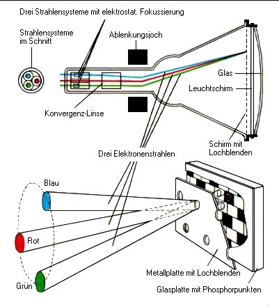 Beim Empfang nimmt der Fernsehempfänger sowohl die übertragenen Bild- als auch die Tonträgerwellen mit einer gemeinsamen Antenne auf und wählt den Sender. Danach wird das Signal aufgespalten: Das Tonsignal gelangt zum Lautsprecher, die Zeitsignale an die Synchronisations-Schaltkreise, wo sie die waagerechte und senkrechte Position des Elektronenstrahls am Bildschirm bestimmen. Die Farb- und Helligkeitssignale werden an die drei Elektronenkanonen in der Röhrenbasis weitergeleitet (Braun’sche Röhre), die je einen, von Magneten gesteuerten, grünen, roten und blauen Strahl zeilenweise auf die Leuchtschicht des Bildschirms zeichnen. In Deutschland wird dabei seit 1952 die Gerbernorm von 625 Zeilen genutzt, was bei dem gängigen Bildformat von 4:3 (Breite:Höhe) eine Auflösung des Bildes in rund 520 000 Einzelpunkte bedeutet. Die 625 Zeilen werden 25-mal je Sekunde neu gezeichnet. Da dies aber zuwenig ist, um Bewegungen unter Vermeidung von Flackern abzubilden, andererseits aber eine Erhöhung der Abtastfrequenz unwirtschaftlich wäre, wendet man das sogenannte Zeilensprungverfahren an, bei dem der Elektronenstrahl beim Abfahren des Bildschirms nur jede zweite Zeile zeichnet und die fehlenden eine fünfzigstel Sekunde danach ergänzt. Jedes Fernsehbild besteht also aus zwei ineinander geschobenen Zeilenrastern. Dieses seit 1953 vom NTSC (National Television System Committee der USA) entwickelte Prinzip einer Farbbildröhre wies aber noch Schwächen in der Farbwiedergabe auf, die ab 1967 durch Einführung des PAL-Systems in Deutschland praktisch beseitigt werden konnten (in Frankreich hat sich das SECAM-System durchgesetzt).