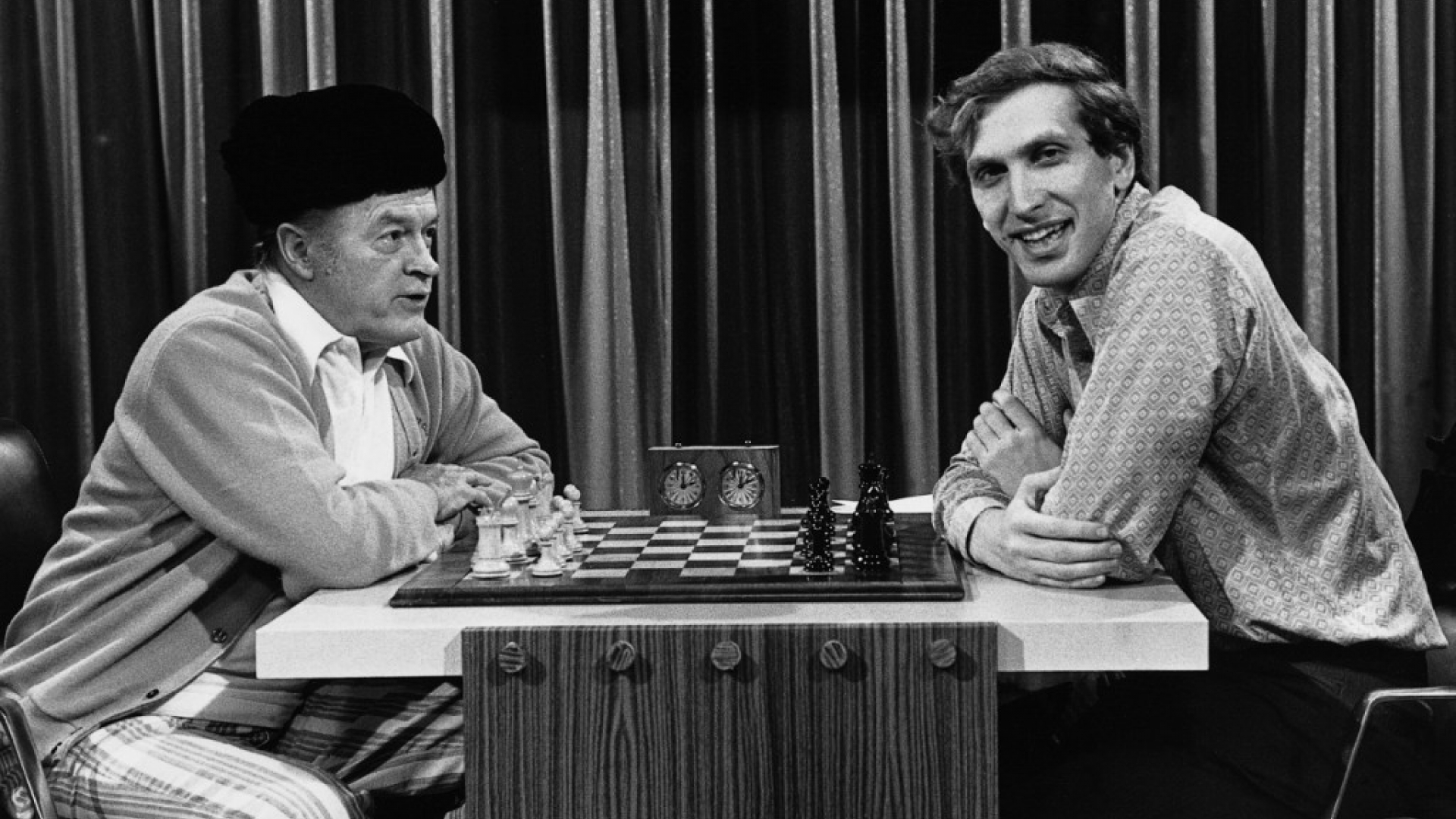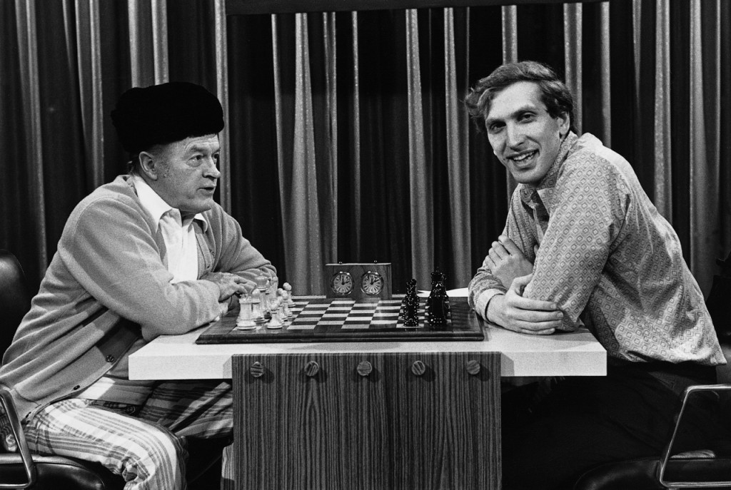 Schachweltmeister Bobby Fischer (rechts) mit dem US-amerikanischen Showmaster Bob Hope
