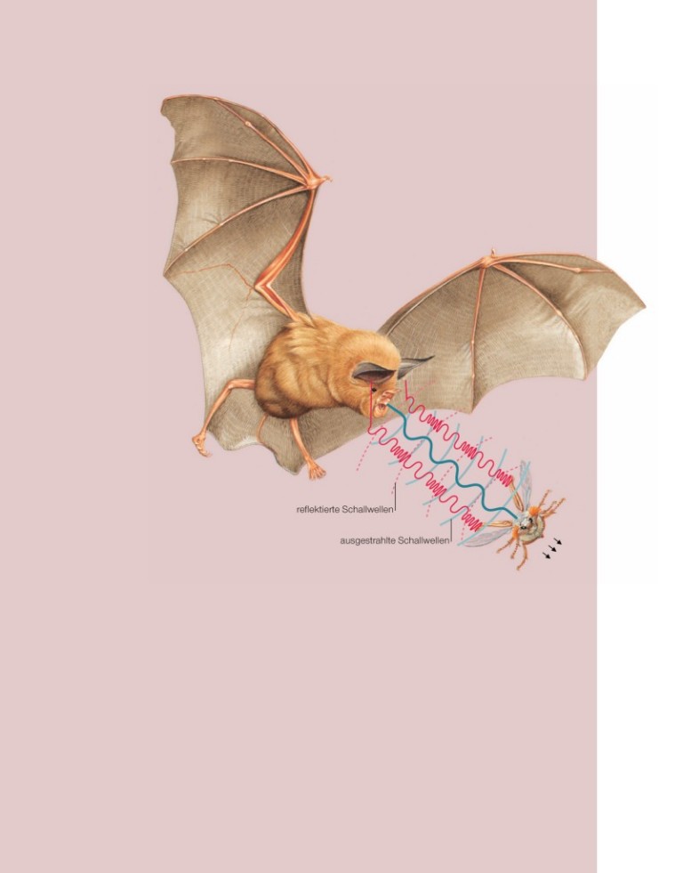 Eine Fledermaus macht ihre Beute über Echoortung aus. Durch ihre Nasenlöcher stößt sie gleichmäßig hohe Peiltöne im Ultraschallbereich aus, die durch ihre beweglichen Nasenblätter wie zu einem akustischen Scheinwerfer gebündelt werden. Wird ein fliegendes Insekt von diesen Pulsen erfasst, moduliert dessen Flügelschlag die Frequenz und die Amplitude des zurückkehrenden Tons. Die feinen Ohren der Fledermaus können nun die Größe, Struktur und Position des Insekts und sogar dessen Flugrichtung ausmachen. Ununterbrochen zurückkehrende Echos liefern der Fledermaus nicht nur Informationen über mögliche Beute, sondern ein präzises Schallbild ihrer ganzen nächtlichen Umgebung.