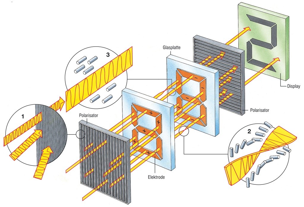 optisches Anzeigeelement. Zwischen durchsichtigen Elektroden liegt eine dünne Schicht eines Flüssigkristalls, die, je nachdem, ob eine Spannung an den Elektroden anliegt oder nicht, durchsichtig oder undurchsichtig ist.