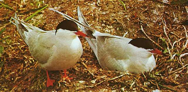 Flussseeschwalben – kenntlich am roten Schnabel mit dunkler Spitze – brüten meist auf dem nackten Boden. Männchen und Weibchen, die sich äußerlich nicht unterscheiden, wechseln sich beim Brüten ab.
