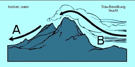 A = beim Absinken Wärmezunahme um 1° C je 100 m, B = beim Aufsteigen Wärmeabnahme um 1/2° C je 100 m gesättigter Luft
