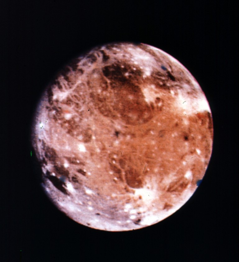 Ganymed ist der größte Jupitermond. Aufnahme der Raumsonde Voyager 1 aus einer Entfernung von ca. 2,6 Millionen km.