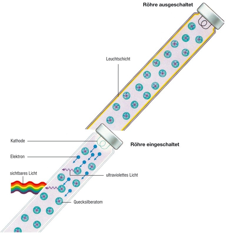 3. Leuchtröhren (Fluoreszenzlampen) sind Gasentladungslampen, bei denen die erzeugte Ultraviolettstrahlung gewisse anorganische Chemikalien (Magnesium-Wolframat, Zinksilicat, Cadmiumborat u. a.) zum Selbstleuchten anregt (Fluoreszenz). Die Fluoreszenzstoffe werden als feinkörniges Pulver auf die Röhreninnenwand aufgetragen.