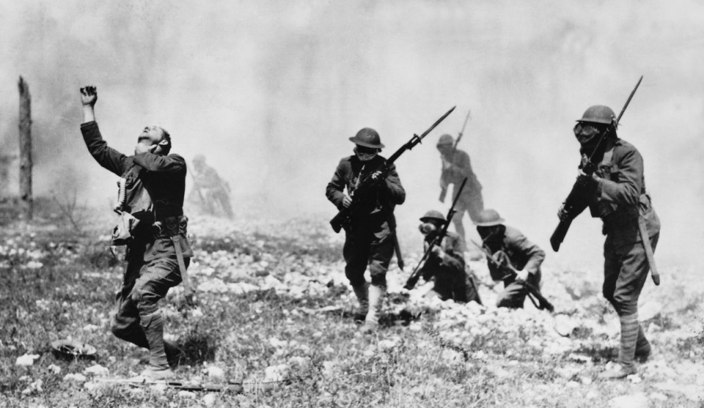 Mit Gasmasken rückten US-amerikanische Truppen am 20. 5. 1918 in Frankreich vor.