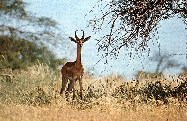 Ein sehr schlanker Körperbau, hohe, dünne Läufe und ein überlanger Hals sind die Kennzeichen der Giraffengazelle oder des Gerenuks. Diese Tiere leben in der Buschsteppe Ostafrikas von Somalia bis Nordtansania.