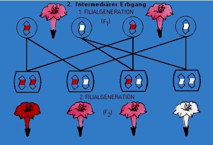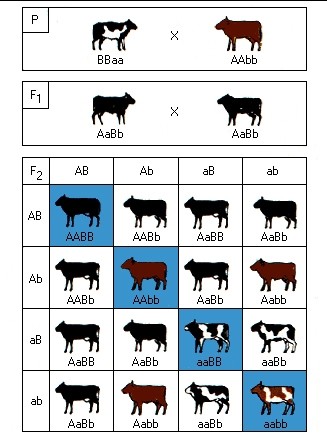 3. Mendelsches Gesetz: Neukombination der Gene, dargestellt anhand der Kreuzung zweier Rinderrassen. Es entstehen in der 2. Filialgeneration (F2) vier verschiedene Kombinationen oder Rassen (blaue Kästchen), von denen eine gänzlich neu ist, nämlich braungescheckt (Neukombination). Dieses Gesetz ist - neben seltenen Mutationen - die Grundlage jeder Rassen-„Neuzüchtungö.