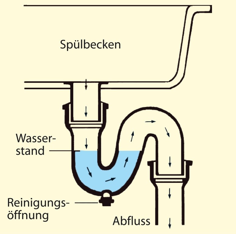 U-förmig gekrümmtes, mit Wasser gefülltes Rohrstück in Abwasserleitungen; verhindert den Durchtritt von Gasen aus der Kanalisation.