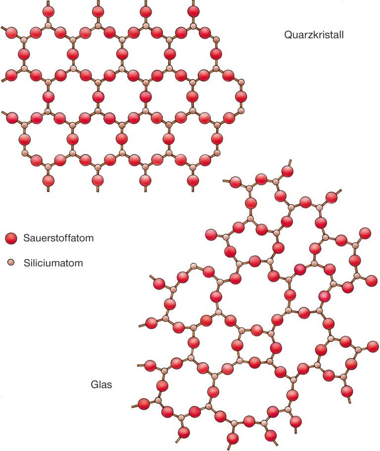 Bei gleicher chemischer Zusammensetzung unterscheiden sich Kieselglas und Quarz durch die räumliche Anordnung der Grundbausteine. Im SiO2 ist die kleinste Struktureinheit der SiO44–-Tetraeder, bei dem um ein Si4 + -Ion in der Mitte vier O2–-Ionen in den Eckpunkten eines Tetraeders angeordnet sind. Beim Quarzkristall sind diese Tetraeder regelmäßig in gesetzmäßiger Weise angeordnet. Im Kieselglas dagegen liegt ein unregelmäßiges Netzwerk von über die Ecken verknüpften Tetraedern vor. Aus diesem lockeren Aufbau resultiert die geringere Dichte des Glases.
