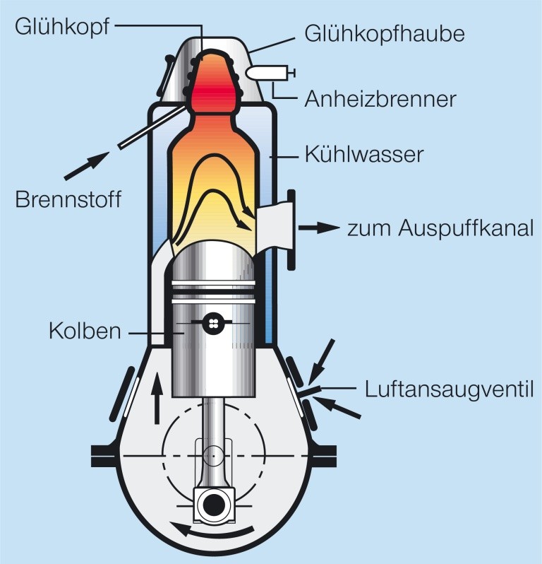 ein Verbrennungsmotor, bei dem sich der Brennstoff (Rohöl) an einer heißen, ungekühlten Prallfläche (Glühkopf) unter geringerem Verdichtungsdruck als beim Dieselmotor entzündet; arbeitet meist im Zweitakt und startet durch Glühkerze oder durch Erwärmen des Glühkopfs.