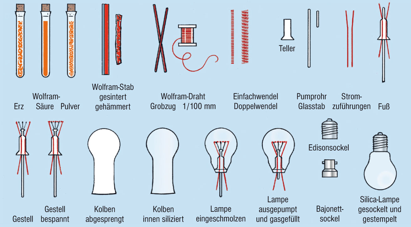 Die Entwicklung der Glühlampe setzte 1879 mit der Kohlefadenlampe von T. A. Edison ein. In Patentprozessen stellte sich aber heraus, dass H. Goebel schon 25 Jahre früher solche Lampen gebaut hatte. 1889 schlug der Chemiker C. Auer von Welsbach Glühlampen mit Metallfäden vor, die er dadurch gewann, dass er eine Paste mit Osmium durch feine Düsen drückte und diesen Faden dann trocknete und bei Luftabschluss glühte. Ein gezogener Draht, und zwar aus Tantal, wurde zum ersten Mal 1903 benutzt. Etwa von 1910 an setzte sich das Wolfram durch, nachdem es gelungen war, Verarbeitungsverfahren für dieses Metall zu entwickeln. Bis zu diesem Zeitpunkt waren die Glaskolben luftleer; um 1910 schlug der Amerikaner J. Langmuir vor, die Kolben mit einem neutralen Gas zu füllen und den Draht zu wendeln.