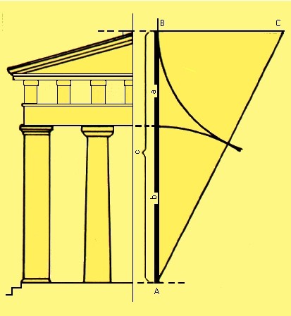 Proportionen von Höhe der Säulen und Gesamthöhe eines dorischen Tempels. Es gilt: BC = 1/2 AB.