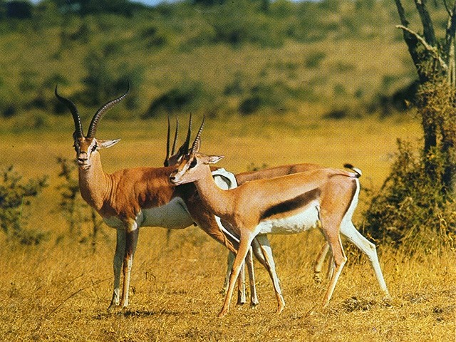 Bei den Grantgazellen tragen beide Geschlechter Hörner. Diese Antilopenart ist in Ostafrika beheimatet und bildet hier in den Steppengebieten vor allem zur Trockenzeit große Herden aus männlichen und weiblichen Tieren.
