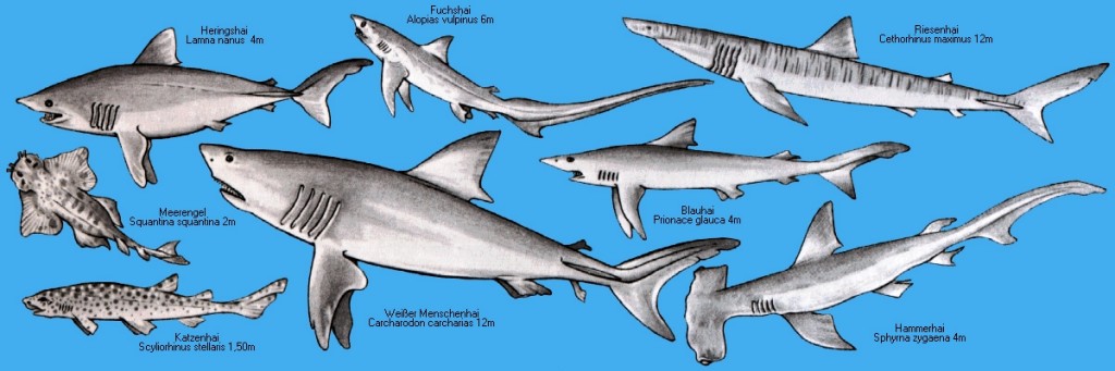 Zu den Haien zählen u. a. die Familien Grauhaie, Krausenhaie, Hornhaie, Sandhaie, Makrelenhaie, Riesenhaie, Ammenhaie, Katzenhaie, Walhaie, Blauhaie, Hammerhaie, Dornhaie, Nagelhaie, Sägehaie, Engelhaie.