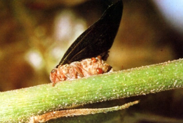 Neben Hautflüglern befallen die Fächerflügler einige weitere Insektengruppen, so, wie hier, auch Zikadenarten. Für die parasitäre Lebensweise sind die Weibchen stark modifiziert: unnötige Organe wie Flügel, Beine, Fühler und Augen gingen verloren.