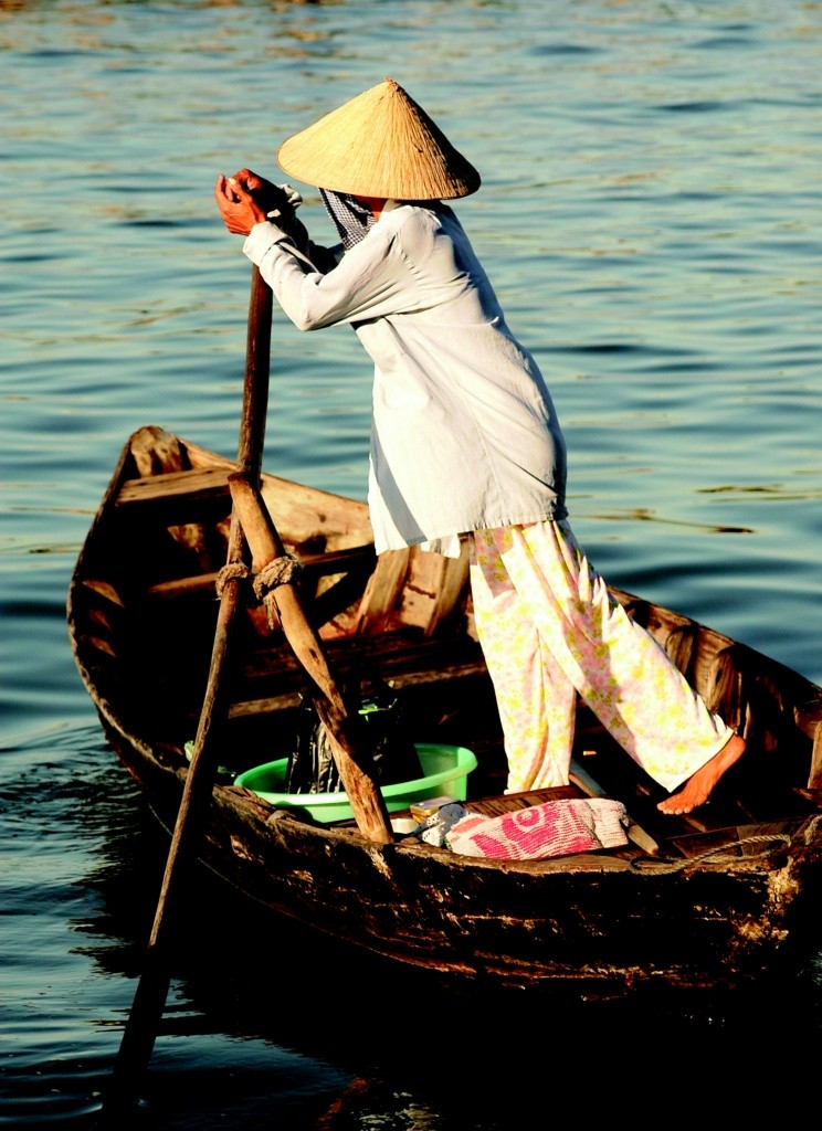 Fischer auf seinem kleinen Boot in Hanoi, Vietnam.