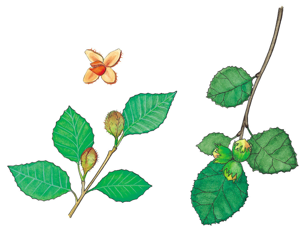 Haselnuss, Buche und Buchecker