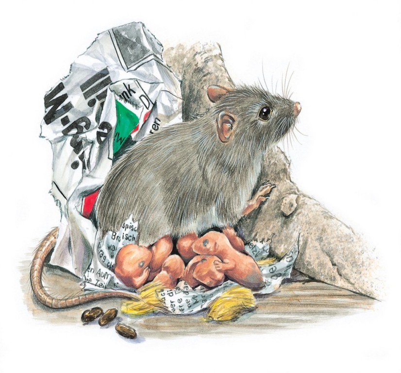 Die Hausmaus ist ein Allesfresser; vom Speck bis zum Gemüse verzehrt sie alles. Ihr langer Schwanz ist mit Schuppen bedeckt, die ringförmig angeordnet sind.