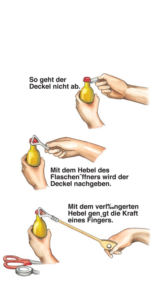 Grundform der einfachen Maschinen: ein um eine feste oder bewegliche Achse drehbarer Körper (meist eine Stange). Der Abstand vom Drehpunkt zum Angriffspunkt der Kraft heißt Hebelarm. Je nachdem, ob die Kräfte auf derselben Seite oder auf verschiedenen Seiten des Drehpunkts angreifen, werden einarmige Hebel und zweiarmige Hebel unterschieden. Beim sog. Winkelhebel, bei dem Drehpunkt und Angriffspunkte ein Dreieck bilden, kommen die senkrechten Abstände Drehpunkt–Kraft als Hebelarme in Betracht. Nach Archimedes ist der Hebel im Gleichgewicht, wenn das Drehmoment aus Kraft (P1) und Kraftarm (l1) gleich ist dem Drehmoment aus Last (P2) und Lastarm (l2):