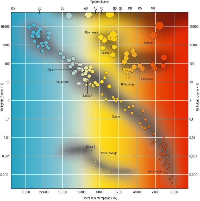 ein Diagramm, das die Beziehung zwischen Leuchtkraft (absoluter Helligkeit) und Spektralklasse (bzw. Temperatur und Farbe) der Fixsterne zeigt; ein wichtiges Hilfsmittel der Astrophysik. Im Hertzsprung-Russell-Diagramm ordnet sich die Mehrzahl der Sterne in der sog. Hauptreihe an, die von blauen Sternen großer Leuchtkraft und hoher Oberflächentemperatur (10 000–20 000 °C) über sonnenähnliche gelbe Sterne zu den roten Zwergsternen niedriger Temperatur (2000–3000 °C) und geringer Leuchtkraft reicht. Daneben gibt es den sog. roten Riesenast, auf dem gelbe und rote Sterne großer Leuchtkraft und großen Durchmessers stehen. Eine feinere Unterteilung bieten die Leuchtkraftklassen.