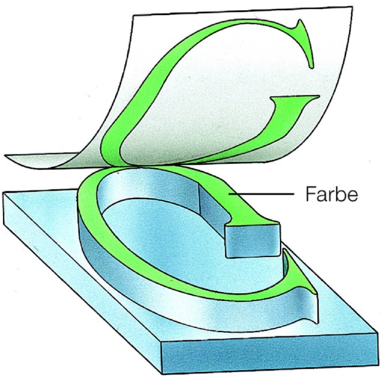 Bei der ältesten Drucktechnik, dem Hochdruck, sind die farbtragenden Teile erhaben über den nichtdruckenden angebracht. Walzen verteilen dicke Teigfarben auf der Druckform, bevor man die Platte gegen ein Blatt Papier presst.