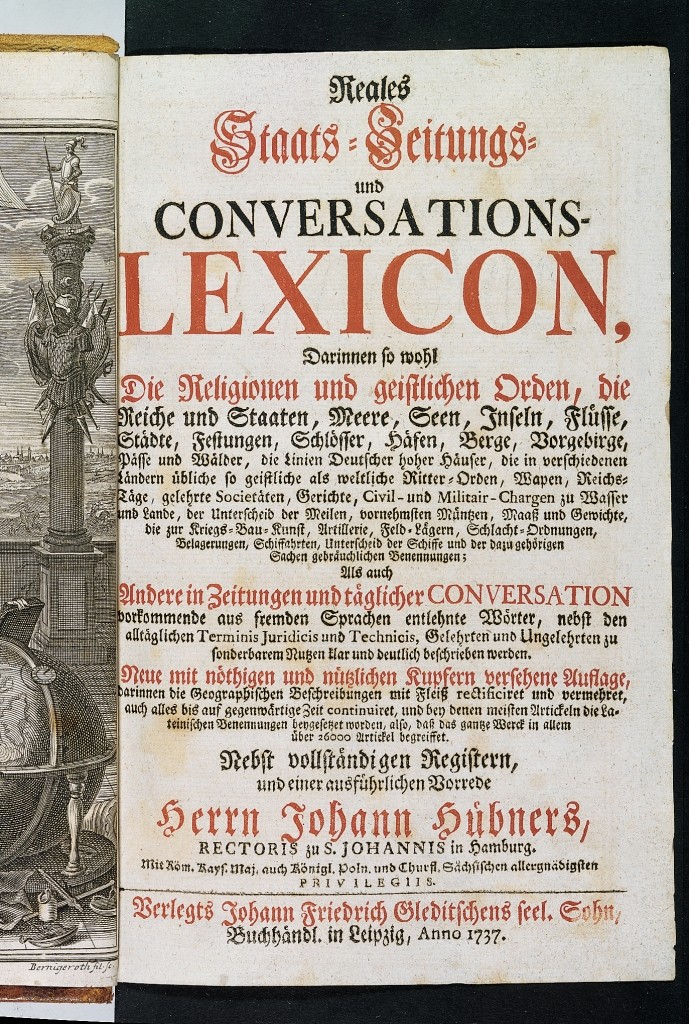 Reales Staats-Zeitungs-u. Conversations-Lexikon, nebst vollständigen Registern und einer ausführlichen Vorrede Herrn Johannes Hübners, Leipzig 1737, Titelblatt.