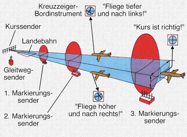 Schema des Landeanflugs mit Hilfe des Instrumenten-Landesystems (ILS)