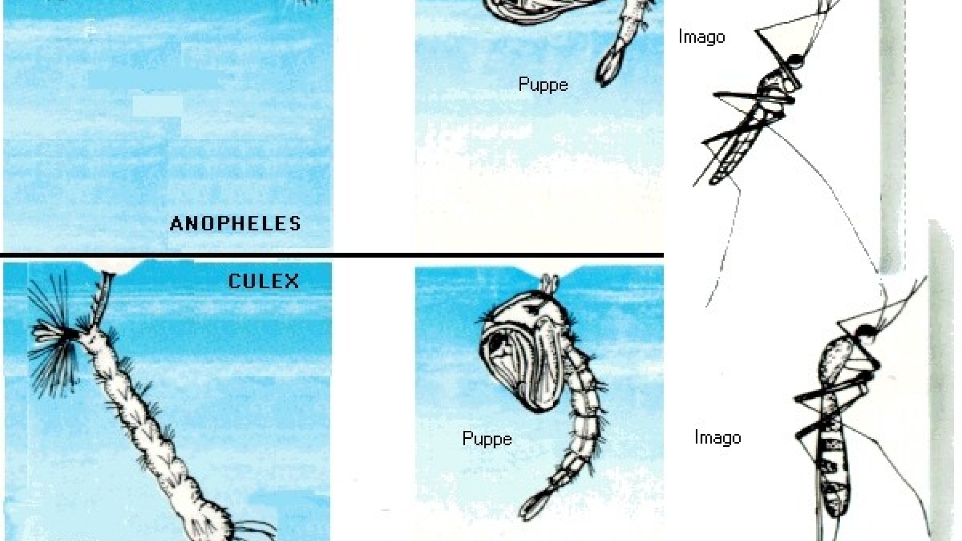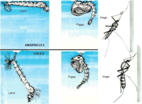 Vergleichende Darstellung der blutsaugenden Stechmücken-Gattungen Culex und Anopheles: Larven- und Puppenstadium, Vollinsekt nach der Metamorphose. Larven- und Puppenstadium werden im Wasser zugebracht. Larve und Puppe hängen mit ihren Atemrohren an der Wasseroberfläche und ernähren sich von im Wasser schwebenden Mikroorganismen. Bei Gefahr lassen sie sich in die Tiefe absinken. Aus der Puppe schlüpft schließlich das Vollinsekt.