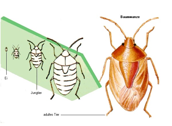 Insekten ohne Metamorphose wie das Silberfischchen (Lepisma saccharina) gleichen nach dem Schlüpfen den Adulten, sind aber kleiner. Im Gegensatz dazu durchlaufen hemimetabole Insekten wie die Baumwanze (Chlorochroa ligata) eine unvollständige Metamorphose.