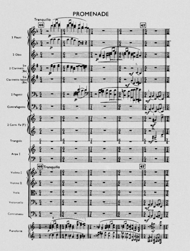 Teil der Promenade aus »Bilder einer Ausstellung« von M. Mussorgskij in der instrumentierten Fassung von M. Ravel, darunter in der ursprünglichen Fassung für Klavier.