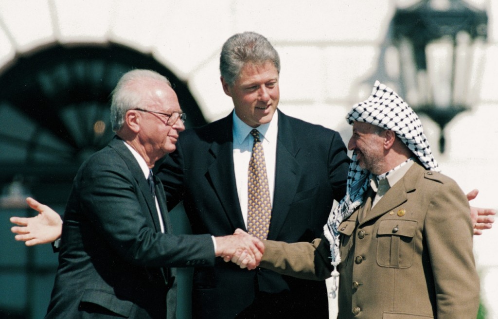 Bill Clinton (Mitte) und Israels Ministerpräsident Izhak Rabin beim historischen