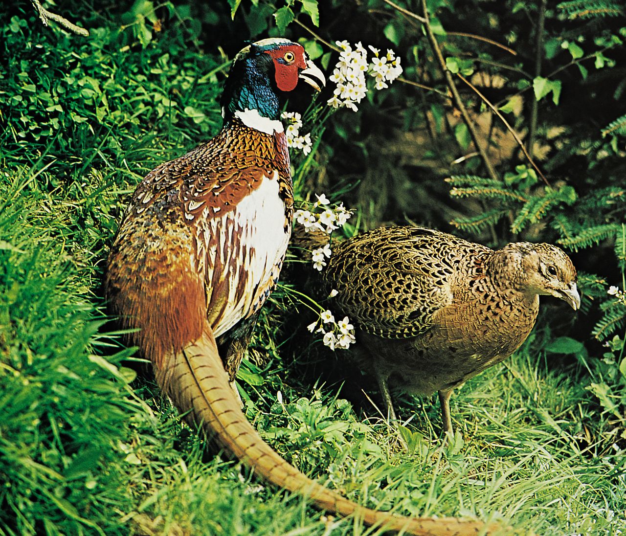 Die Hähne einiger Hühnervögel gehören mit den schillernden Gefiederfarben und bunten Nacktstellen um das Auge und am Hals zu den schönsten Vögeln; die Hennen sind in ihrem braun gemusterten Gefieder. Im Bild ein Jagdfasanenpaar.