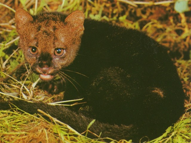 Mit ihrem langgestreckten, schlanken Körper, den kurzen Läufen und dem langen Schwanz ähnelt die Wieselkatze den Mardern. Hier die dunkle Varietät, der Yaguarundi, der früher als eigene Art betrachtet wurde.