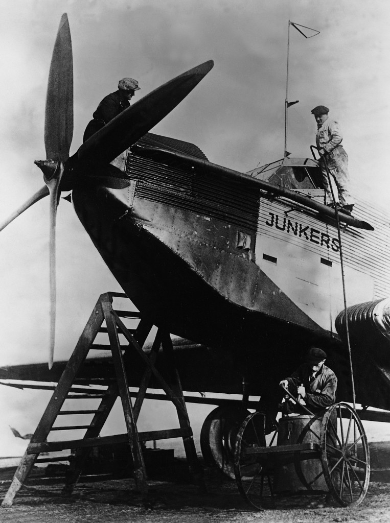 Die »JU 52« war zunächst als einmotoriges Flugzeug gebaut worden. Ab 1932 wurde sie mit drei Motoren ausgerüstet.