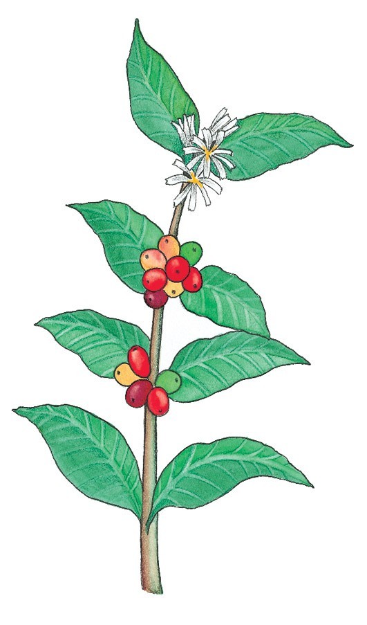 Kaffeepflanze mit Blüte und Frucht